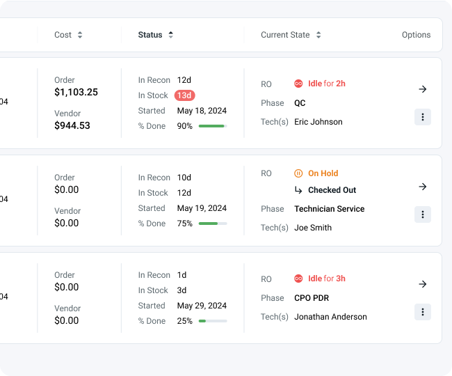 Track every vehicle from trade-in to frontline. Assign work, monitor progress, and identify delays before they cost you revenue.
