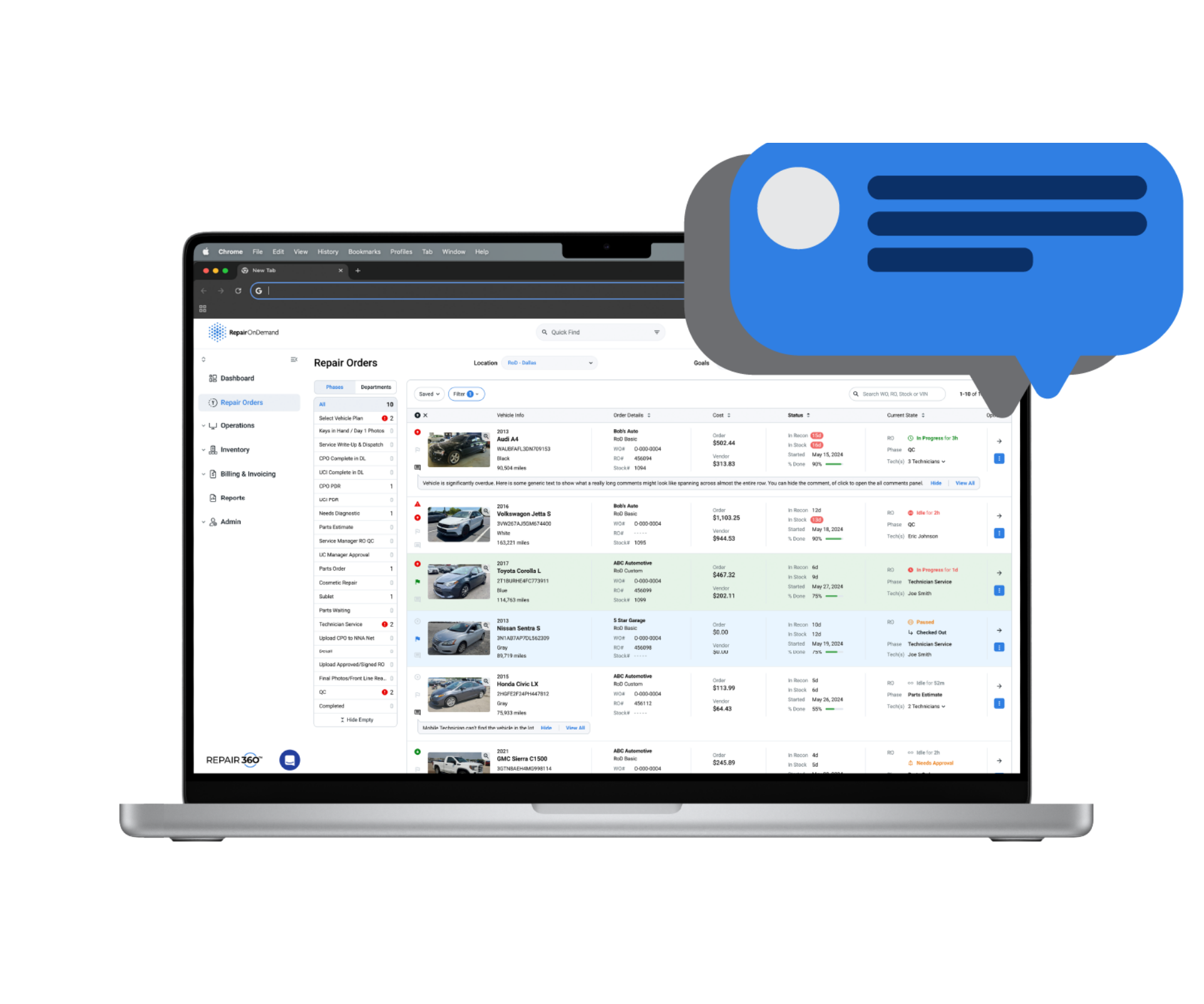 In-app Chat replaces static notes and disconnected conversations with structured, real-time messaging tied directly to the work. Teams can collaborate using messages, photos, and attachments — all in one place — keeping decisions, approvals, and context close to the Repair Order